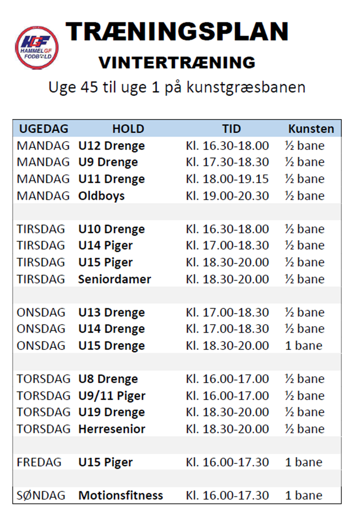 Træningsplan for kunstgræsbanen fra uge 45