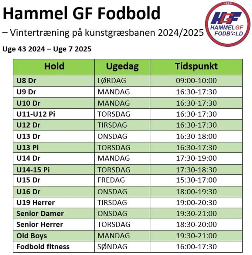 Alle de nedenstående hold i Hammel GF Fodbold, tilbyder vintertræning. De starter op med træningen i uge 43 på Hammel Kunstgræsbane.